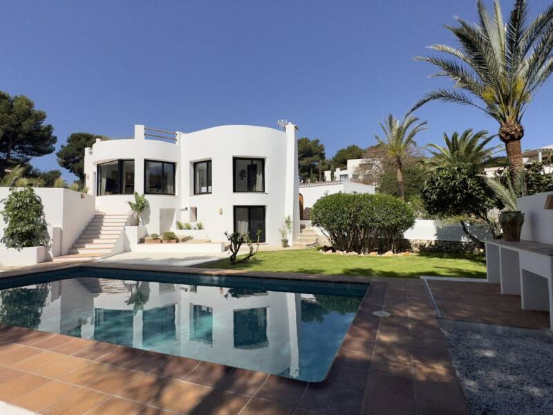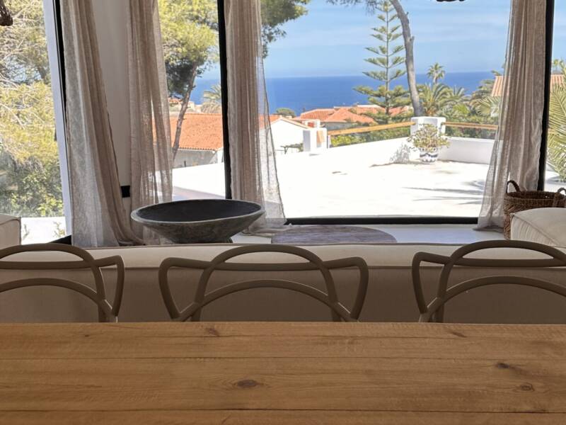 A stunning south-facing villa with captivating sea views, completely refurbished into a bright white Ibiza-style retreat.