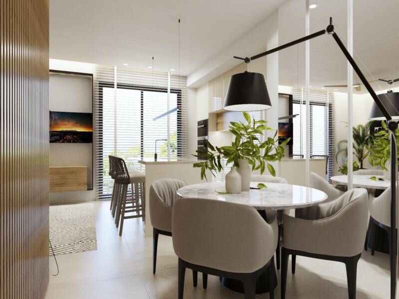 It comprises walking and cycling paths, sport facilities, paddle and tennis courts, a mini-golf course, gardens, dog parks, leisure areas, clubhouse…. Also in the central area is the jewel of the resort, a crystal-clear artificial lake of almost 17.000m2 of water surface, surrounded by white sandy beaches and palm trees, bringing a piece of the Caribbean to the Murcia Region.