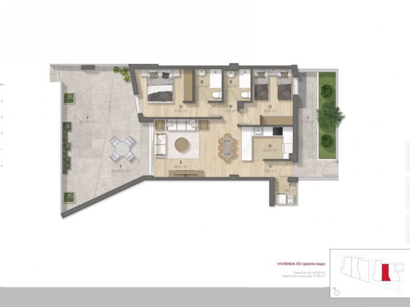 Ground floor bungalows with private garden and first floor bungalows with private solarium.