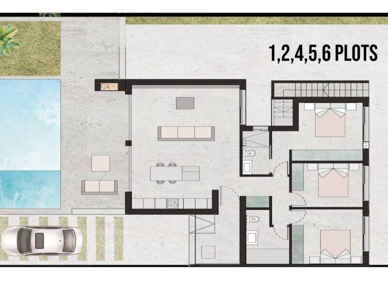 The villas are designed on one level with elevated ceiling to the lounge/kitchen area, each villa boasts wrap around terrace / sun zones on the ground floor and a large private solarium on the first floor to enjoy hours of sunshine, all year round.