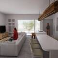 The house has an stunning presence, with the living-room volumen having higher roof than normal, making a huge living room with an open kitchen and a kitchen/dining island (dining table connected to kitchen island).