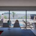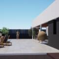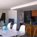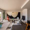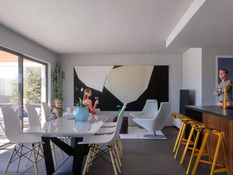 A very large living room plus dining and american kitchen, long glass sliding doors communicating with the exterior pool area, where there´s a 8,5m pérgola that ensures maximum confort in the exterior, its masonry beam can hold a hung bubble chair or hammock.