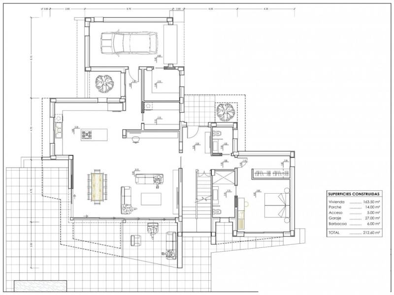Both the living room and the bedroom have direct access to the partially covered terrace with swimming pool.