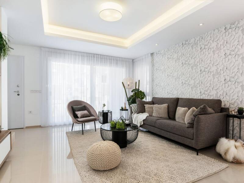 Modern townhouses build over 2 floors and has 3 bedrooms, 2 bathrooms, open plan kitchen and the lounge area, fitted wardrobes, terraces, private garden and solarium.